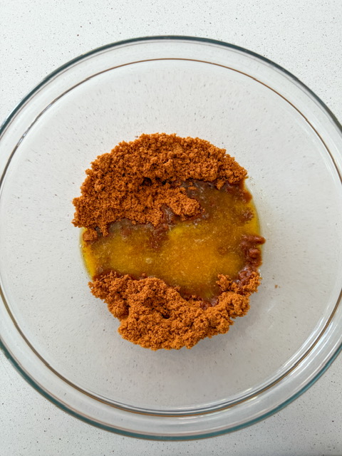 - Melt three tablespoons of Biscoff in the microwave for about 30 seconds. Use a teaspoon and spoon it on top of the cheesecake mix.