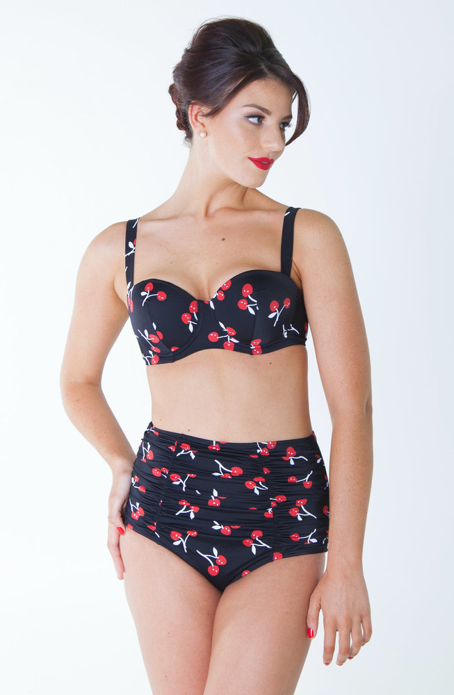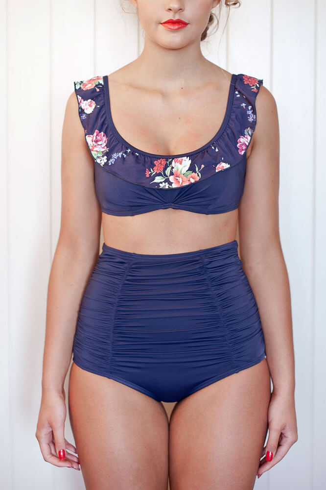 If you're pear shaped you want to choose a swimsuit that has good coverage across the bum, rather than something high cut. Also, as a mum there's nothing worse than bending over to pick up a million toys at the beach and flashing the people next to you. Make sure the top has a good lift and a bit of padding, to help balance you out a bit. You can also totally rock a ruffle in the top.