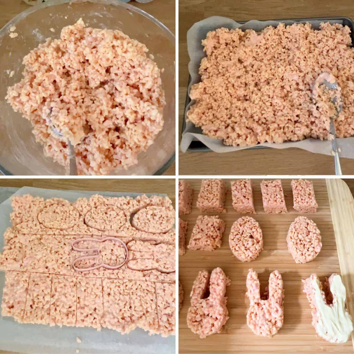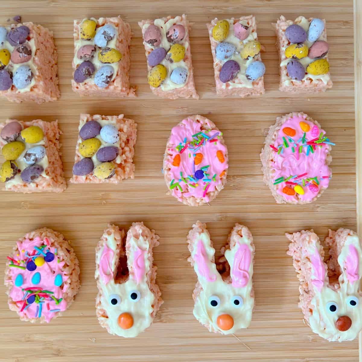 Once it's set, remove it from the cake tin. I cut mine into three rows (lengthways) and then made one row the bunnies, one row the eggs, and the last row I cut into rectangle slices. But you can do yours however you like!