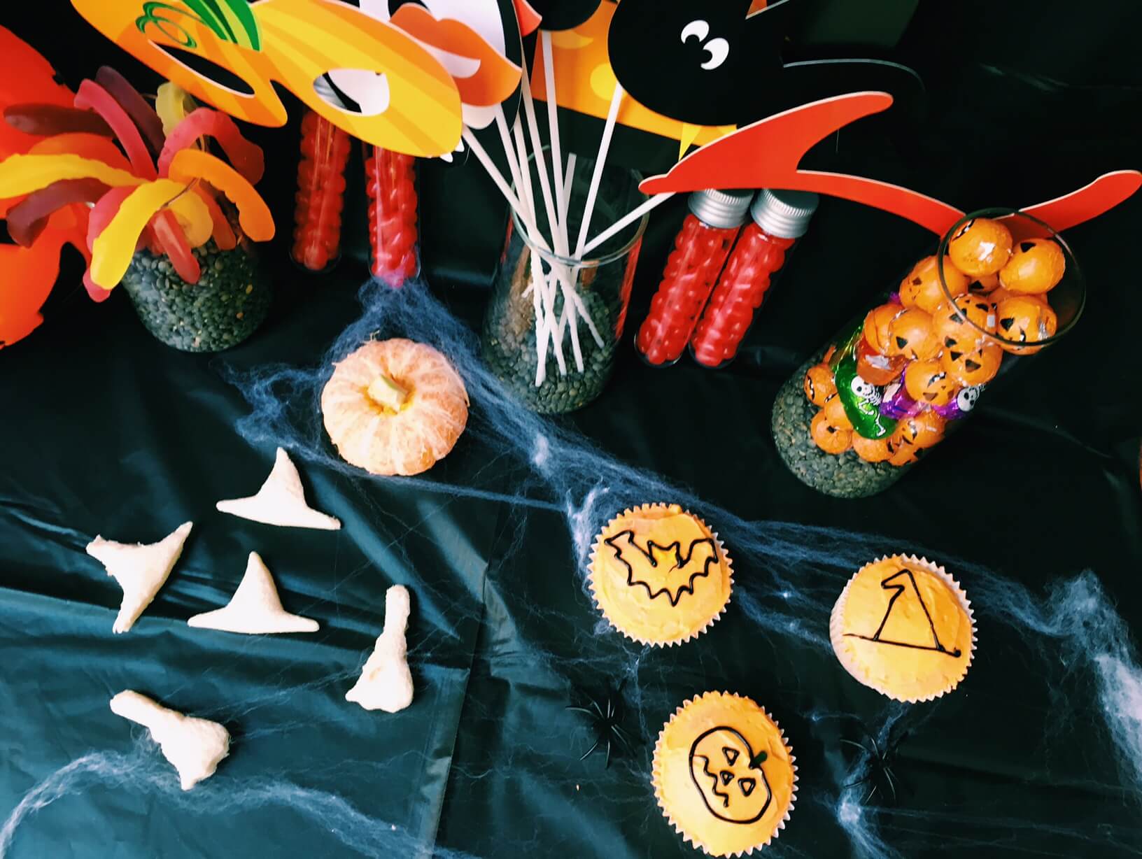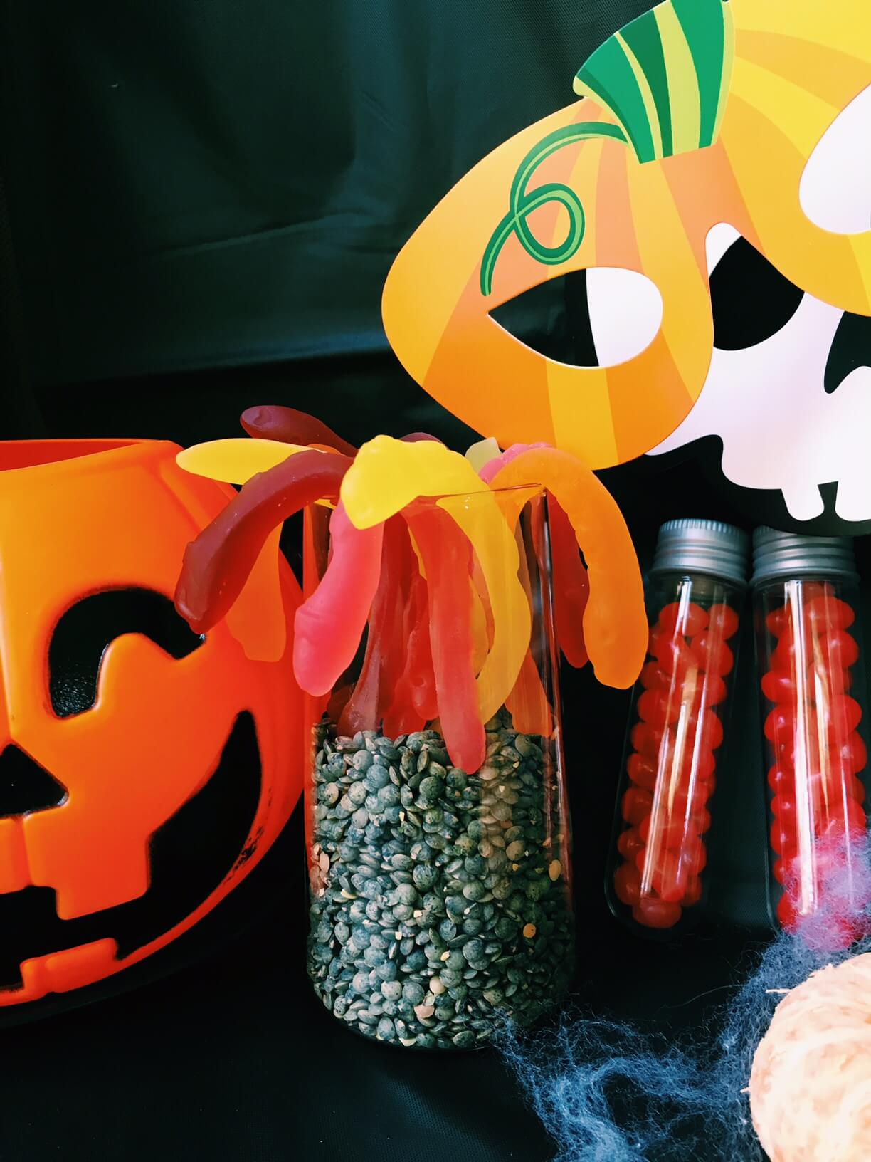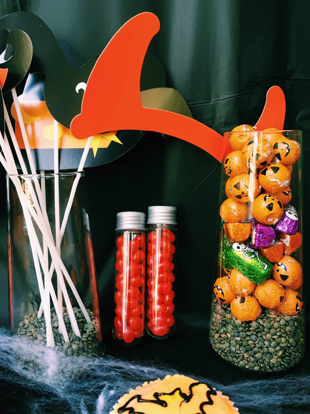 For the set up I've used the Partylite symmetry trio set and filled them partly with black lentils (because they are cheap and look a bit creepy!) I filled the middle one with super cute Halloween themed photo booth props that the kids can have fun playing with. I found these at my local $2 shop (Warringah Mall if you're local to me!) In the others I put Natural Confectionary Snakes (give them a bit of a stretch first though) and Halloween chocolates I found at Target.