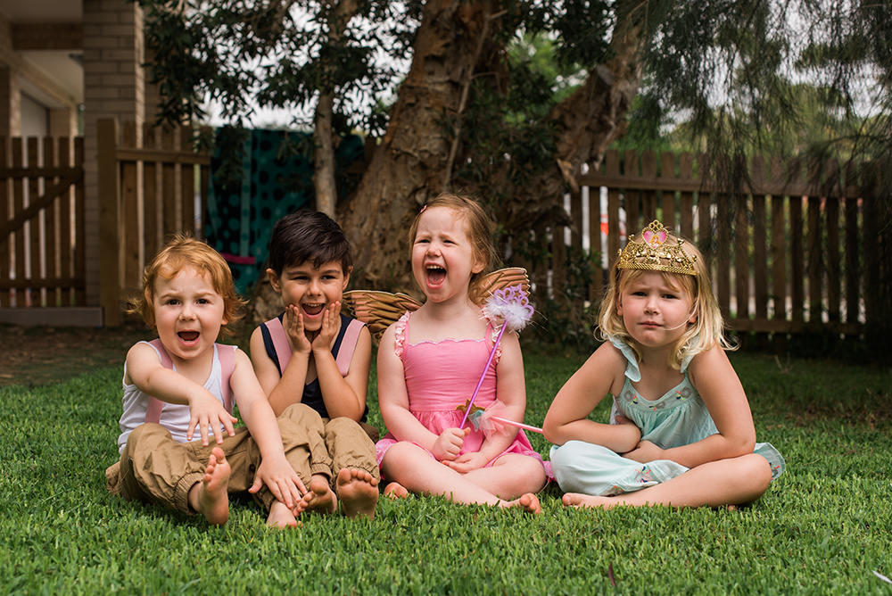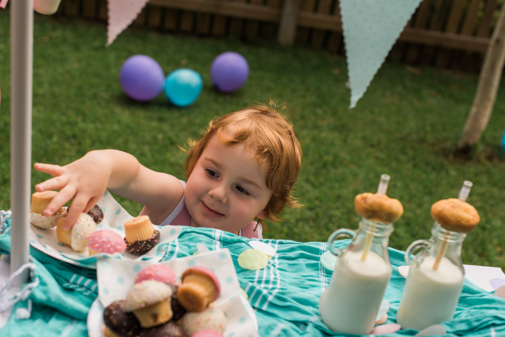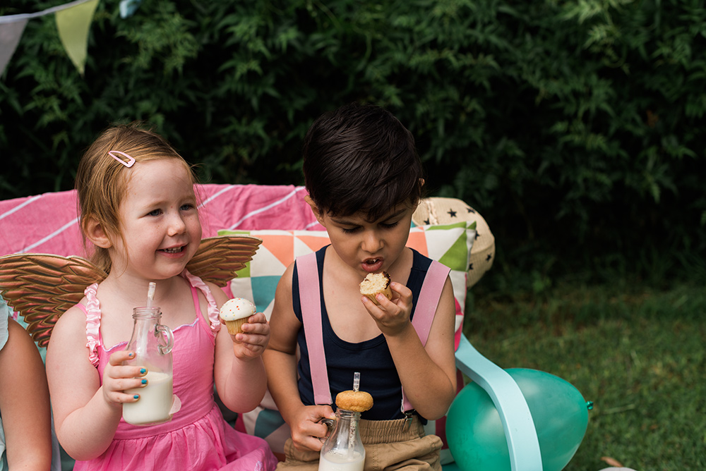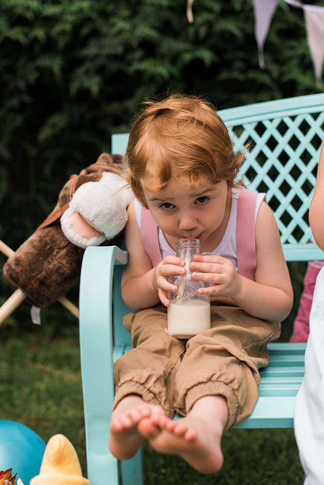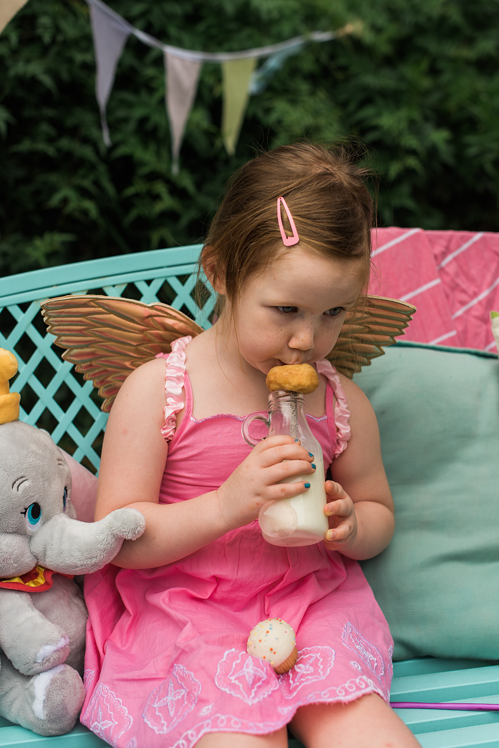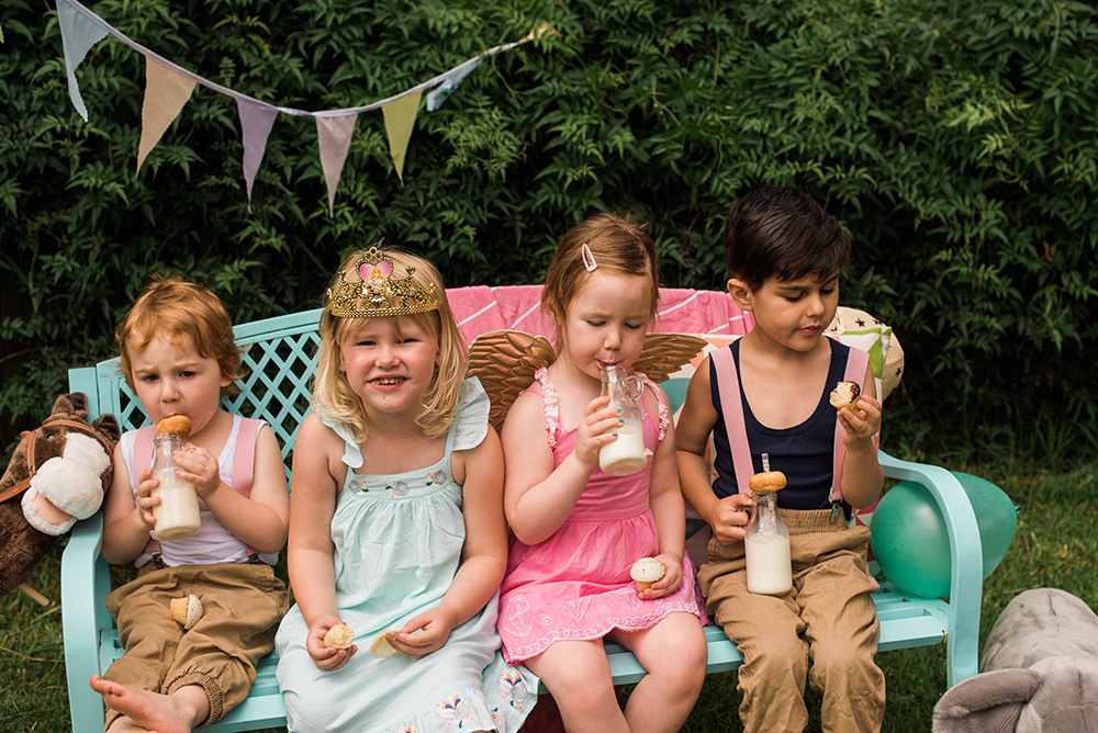 We set up the garden as a garden party, with our cute garden bench, some vintage toys and our milk bar and bunting. I found some mini doughnuts to put on the top of the milk bottles (because it’s always something I wanted to do!) and got some mini cupcakes. The bigger kids dressed up (because it’s any excuse for dress ups over here!) and off they went!